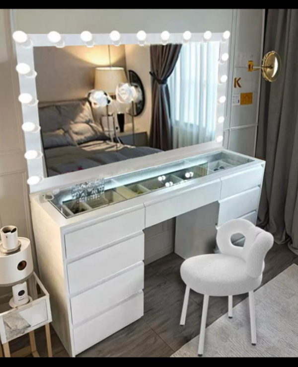 השידה עשויה MDF איכותי במיוחד בצביעה בתנור, מה שמבטיח עמידות, מראה חלק וגימור לבן מבריק שנשמר לאורך זמן. אין צורך לחשוש מקילופים, שריטות קלות או שינויי צבע – מדובר בשידת איפור שמיועדת לשימוש אינטנסיבי אך שומרת על המראה החדש והנקי שלה לאורך זמן. הרוחב המרשים של 1.5 מטר מבטיח שטח אחסון נדיב – אפשר לארגן בקלות מוצרי איפור, תכשיטים, מברשות ועוד, בצורה נגישה ומסודרת. גם אם יש לך המון פריטים, הכול מוצא את מקומו בצורה אסתטית ונוחה. מעבר לפרקטיות, השידה תורמת לעיצוב הכולל של החדר ומעניקה תחושת סטודיו מקצועי – ממש כמו שידת הוליווד אותנטית שמעצבת חלל לא רק לתפקוד אלא גם להשראה ולתחושת יוקרה.
