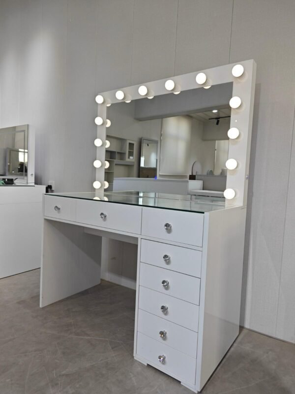 שידת האיפור "קים" עשויה MDF איכותי, עם צביעה בתנור שמקנה לה גימור חלק, עמיד וקל לניקוי. זה לא רק נראה טוב – זה גם מחזיק לאורך זמן, גם בשימוש יומיומי. הצבע הלבן המבריק מעניק לשידה מראה קליל ומואר, שמתאים כמעט לכל סגנון עיצוב – ממודרני ועד קלאסי. החלוקה הפנימית נועדה להיות פרקטית – מקום לארגון מברשות, מוצרי איפור, תכשיטים ועוד – כך שהכול נגיש, מסודר ויזואלית וקל לתחזוקה. כשמצרפים את זה לתאורה המעולה ולמראה רחבה, מקבלים חוויית שימוש כמו בשידת הוליווד מקצועית – כזו שמאפשרת דיוק, ריכוז והנאה בכל תהליך האיפור. מדובר ברהיט שמשלב פונקציונליות גבוהה עם עיצוב יוקרתי – בלי לוותר על אף אחד מהאלמנטים.