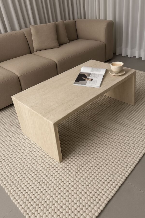 שולחן מלבני בעיצוב אלגנטי בהשראת הסגנון הנורדי, עשוי חומר שיש טרוורטין במרקם אבן טבעית. הבחירה המושלמת לסלון מודרני עם טאצ’ יוקרתי.